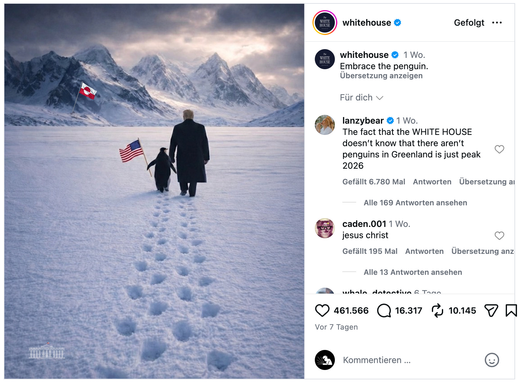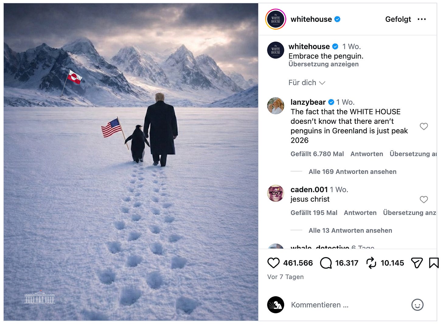 While parts of the internet (including me and a lot of commenters underneath the official Insta post) were still shaking their heads at yet another episode of presidential AI-slop nonsense – after all, penguins live at the South Pole – the internet’s content-exploitation machine was already in full mode. Here is an attempt to unwrap some layers of meaning.
